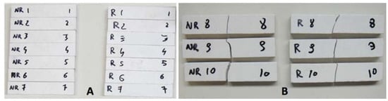 Annealed (R) and not annealed (NR) gres specimens before (A) and after (B) flexural tests.