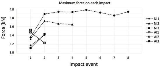 Maximum force in each successive impact event for not-annealed (NI) and annealed (AI) gres.