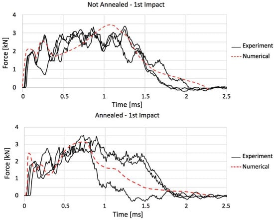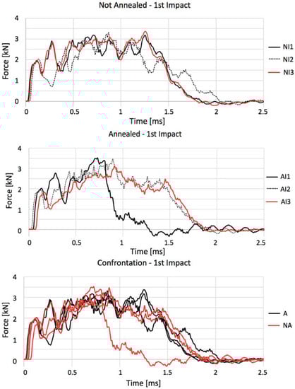 Force–time curves describing not annealed (NI1, NI2, and NI3) and annealed (AI1, AI2, and AI3) impacted specimens along with their comparison.