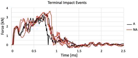 Comparison of terminal impact curves for annealed (A) and not annealed (NA) specimens.