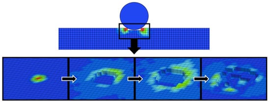 The numerical replication of the drop-weight experiment, shown in Figure 15, yielded according results, in a sense that the most prominent difference between the load–time curves for annealed and not annealed gres is that the first reaches its peak force before the latter. Furthermore, the impact period and maximum forces were on the same level for each case, conferring to the adjusted finite element model a sufficient level of accuracy to be able to reproduce faithfully this test. Besides the curve region near the peak force, where the most significant part of damage occurs making it difficult to be identically mirrored by finite elements, the regions regarding primary loading (0–0.25 ms) and unloading (1.5–2.5 ms) have been reproduced with noticeable precision in the not annealed case, whilst in the annealed one the unloading line was a middle-ground between the experiments that did not fail and the one that failed in the first shock. In none of the cases, the computational model presented terminal failure of the slave material; instead, the damage caused by the indenter was assimilated in the form of an indentation, given that it is not possible to simulate internal micro cracks within a finite element. The damage evolution is shown in Figure 16.