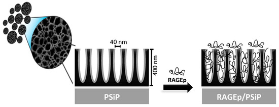Schematic representation of the adsorption of RAGEp onto the PSiP surface and pores in the particle structure. The PSiP are porous irregular discoids with a size distribution of 3 ± 1 µm, a thickness of ~400 nm, and a pore size of 40 nm. The anionic PSiP surface interacts with the cationic RAGEp molecules through electrostatic and/or ion dipole forces.