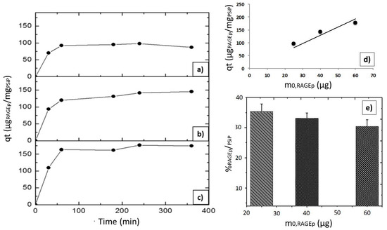 RAGEp adsorption onto PSiP. Adsorption experiments were carried out using 100 μg of PSiP and different initial RAGEp amounts in μg: (a) 25, (b) 40, and (c) 60. A final volume of 250 μL was attained with PBS solution (pH = 7.4). All of the suspensions were stirred at 6 °C during the experiment. The concentration of soluble RAGEp was determined by measuring absorbance at λmax = 199 nm. All of the experiments were conducted by triplicate, and the %SD were as follows: (a) 1.7–3.0%, (b) 0.1–2.5%, and (c) 2.0–3.0. (d) Linear concentration-dependent RAGEp adsorption. Data obtained after 4 h of experiment in the described conditions, r2 = 0.78. (e) Percentage of RAGEp adsorbed onto the PSiP surface (%RAGEp/PSiP) with respect to the initial RAGEp amount (m0,RAGEp). Data are the average values of three experiments.