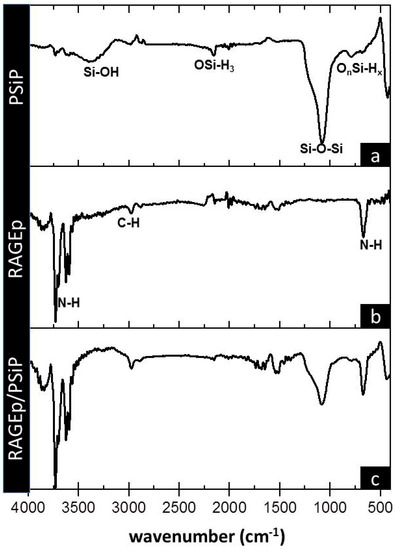 The peptide–particle surface interaction is also observed in the RAGEp/PSiP IR spectrum (Figure 6c), with a decrease in the intensity of several bands with respect to PSiP alone (Figure 6a) and the incorporation of signals corresponding to RAGEp. The RAGEp alone spectrum is shown in Figure 6b with characteristic asymmetric and asymmetric stretching bands at 3698 cm−1, 3592 cm−1, and 667 cm−1 corresponding to NH2, and a stretching band at 2989 cm−1 attributed to C–H. The possible intermolecular forces involved in the RAGEp adsorption are listed in Table 1, where electrostatic and/or ion dipole forces are related with changes on the IR signals.