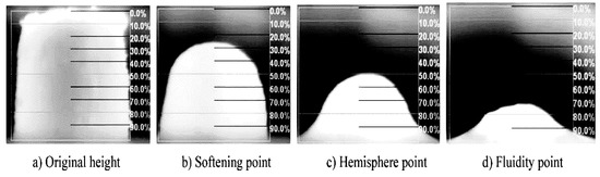 The hemispherical point method was used to test the flow temperature (estimating the liquidus temperature) of mold fluxes [19]. The schematic diagram is shown in Figure 2. Flow temperature is defined as the temperature at which the height of slag column became ¼ of the height of the original slag column in the silicon-molybdenum electric furnace in the heating process. Some researchers [3,20] believed that the flow temperature is approximately equivalent to the liquidus temperature at which mold fluxes are completely melted.