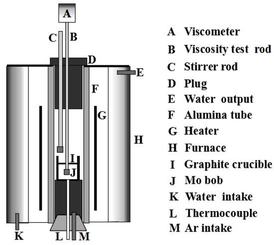 The viscosity–temperature curve of the mold fluxes was measured by a rotating cylinder method through the steady-state and dynamic measurements of the viscosity (BROOKFIELD, Middleboro, MA, USA) [22], and the break temperature was obtained by a tangential method through the viscosity–temperature curve (the break temperature is the point where the viscosity rises abruptly, meaning that the liquid-phase lubrication disappears, and the solid-phase lubrication begins at a certain cooling rate). The schematic diagram of the experimental apparatus is shown in Figure 3. The steady method was to put 250 g samples into the graphite crucible (Φ 75 mm × 100 mm), which was placed in a silicon molybdenum furnace at 1350 °C for 30 min to homogenize its chemical composition; then, the viscosity of molten slag was continuously measured during the cooling process at the rate of 5 K/min to obtain the viscosity–temperature curve. Regarding the balance method, the viscosity of the molten slag was measured at different temperatures while holding for 10 min during the cooling process to obtain the viscosity–temperature curve. The viscosity–temperature curve of molten slag was measured by the balance method in the current study. During the cooling process, the viscosity was measured at a certain temperature after the molten slags were stirred for 5 min at the speed of 100 rpm with the stirring rod, as shown in Figure 3. The viscosity at different temperatures was measured until the viscosity–temperature curve was obtained. The above procedure was repeated by changing the rotational speed to 200 rpm, 300 rpm, and 400 rpm respectively, so the viscosity–temperature curves under different shear stresses were obtained. Then, the viscosity–temperature curve with no agitation (0 rpm) by the balance method was obtained, and it was compared with the viscosity–temperature curves of molten slag with different shear stresses.