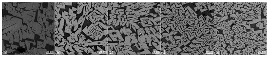 The micromorphology of natural cooled samples stirred for 5 min at 1564 K with different agitation speeds (a) 0 rpm; (b) 100 rpm; (c) 200 rpm; (d) 300 rpm; and (e) 400 rpm.
