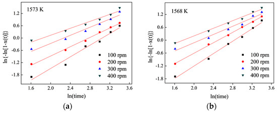 Plots of ln{−ln[1 − X(t)]} versus lnt for isothermal crystallization of mold fluxes under different rotating speeds for 5 min (a)1573 K; (b) 1568 K.