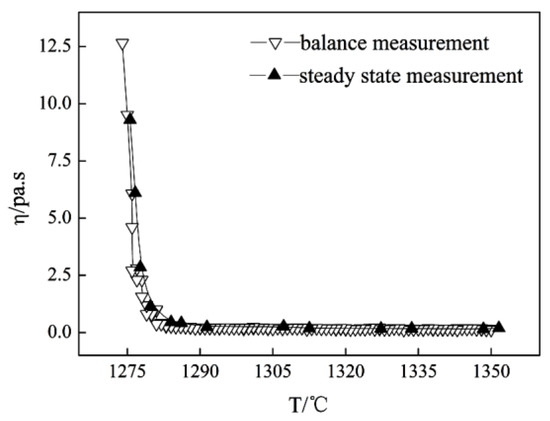 Viscosity–temperature curve of mold flux was obtained by the steady-state and dynamic measurement of the viscosity with no agitation.