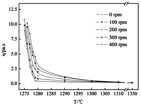 Viscosity–temperature curve of mold flux measured by the equilibrium method with different rotating speeds.