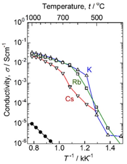 - Takai, S.; Morhishita, Y.; Kondo, Y.; Yao, T.; Yabutsuka, T.; Esaka, T. Electrochemical properties of Cs-substituted CaWO4 and BaWO4 oxide ion conductors. J. Ceram. Soc. Jpn. 2016, 124, 819–822. [Google Scholar] [CrossRef]