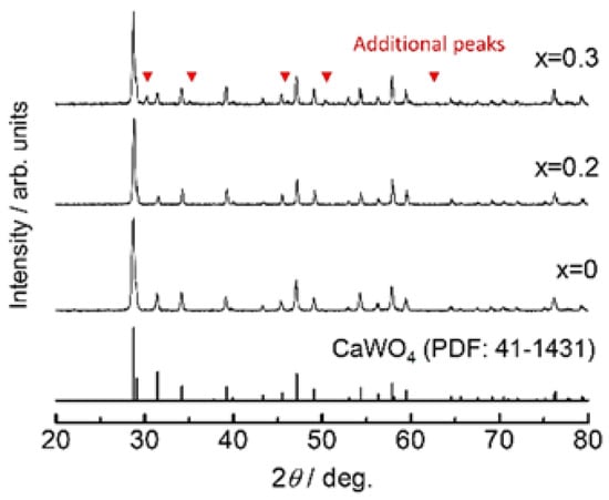 X-ray diffraction patterns of Ca1−xKxWO4−x/2 obtained at room temperature.