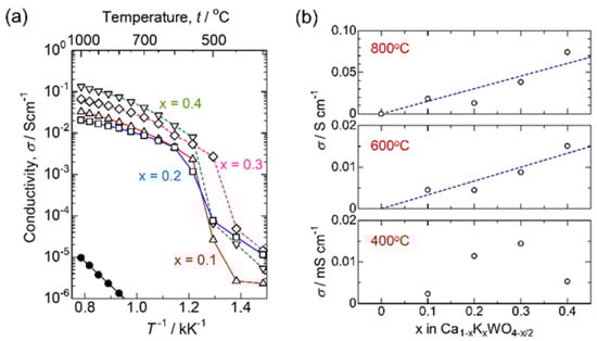 (a) Arrhenius plot of conductivity for Ca1−xKxWO4−x/2. ●: x = 0, △: 0.1, ☐: 0.2, ¯: 0.3, and ▽: 0.4; (b) Conductivity isotherms of Ca1−xKxWO4−x/2 at 400, 600, and 800 °C.