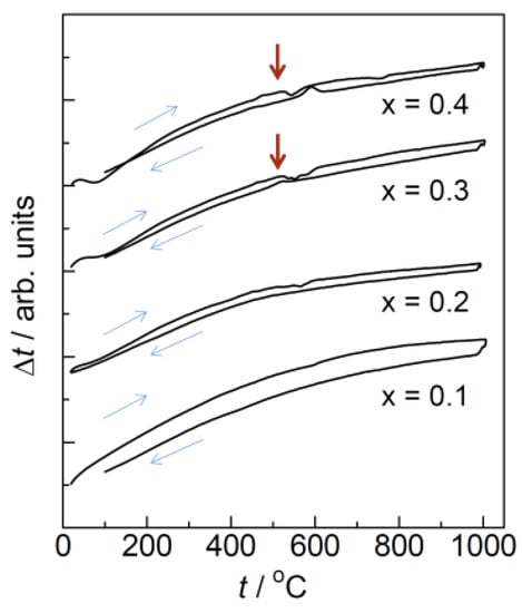 DTA traces of Ca1−xKxWO4−x/2. Red arrows indicate the small endothermic peak observed in the heating direction.