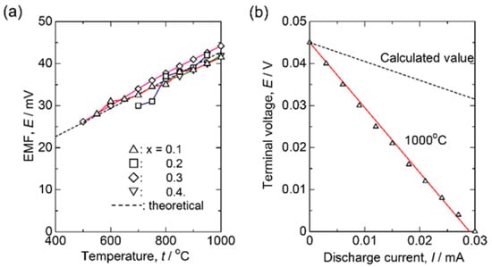 and is indicated by the dashed line. Since the measured EMFs agree well with the calculated one, the predominant charge carrier is not electron but ion. In addition, since the constant current can be drawn from the cell showing linear decrease in terminal voltage with the current as Figure 5b, the charge carrier should be the oxide ions. In Figure 5a, the more interesting aspect is that EMFs obtained for the x = 0.3 or 0.4 beyond the solution limit also coincide with the Nernstian value. To clarify the compositional dependence of the conductivity, the measured electric conductivity is plotted versus potassium concentration as in Figure 3b. At 400 °C, conductivity increases with the potassium composition up to x = 0.3, followed by a drop at x = 0.4. However, the linear relationship between conductivity and potassium concentration can be seen at 600 or 800 °C. Therefore, excess potassium ions are supposed to be incorporated into the Scheelite lattice to form oxide ion vacancy around 500 °C, which allows the high oxide ion diffusion.