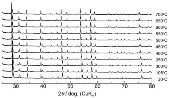 X-ray diffraction patterns of Ca1−xKxWO4−x/2 (x = 0.1) measured at high temperatures up to 700 °C.