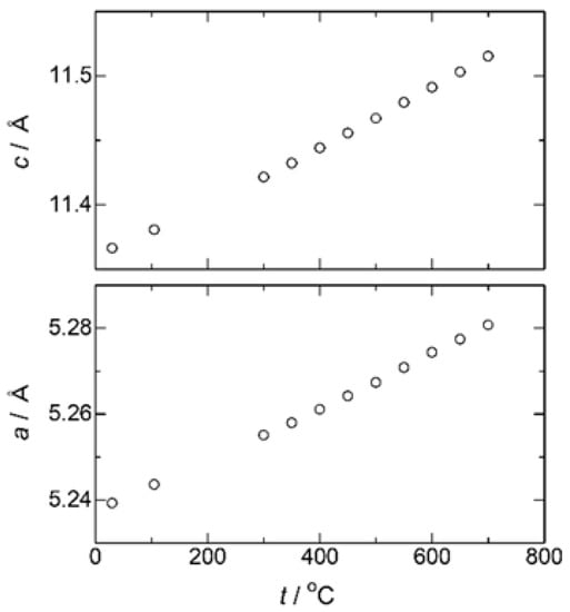 High-temperature X-ray diffraction experiments were then performed focusing upon the conductivity jump accompanied by the endothermic heat at 500 °C. Figure 6 shows the XRD patterns of Ca1−xKxWO4−x/2 (x = 0.1) measured at various temperatures. While diffraction peaks shift toward a lower diffraction angle with temperature due to thermal expansion, any distinct change in peak was not observed around 500 °C. The lattice parameters obtained by the Rietveld refinements are plotted versus temperature in Figure 7. Both a- and c-length increase uniformly without any apparent discontinuity, suggesting that the conductivity jump observed around 500 °C is not accompanied by the drastic change in structure or apparent phase transition. On the other hand, for higher potassium introduction as x = 0.4, diffraction peaks of the second phase were detected at room temperature in Figure 8. Excess XRD peak at 2θ = 30.3° does not shift as other peaks associated with Scheelite-type structure, almost diminishing at 700 °C. This temperature is a little higher than that of the conductivity jump with the endothermic peak, which would be due to that undissolved potassium component, which remains even at the measurement of 700 °C. Assuming that the solution range becomes wider at higher temperatures, the residual second phase would dissolve into the Scheelite lattice above 500 °C to create oxide ion vacancies even for x = 0.4, which would directly contribute to the oxide ion conduction. Even though any excess diffraction peak was not detected for x = 0.2 at room temperature, dissolution of a very small amount of potassium ions into the Scheelite lattice might occur for the observed very small endothermic heat at 500 °C. In addition to the solid solution formation, subtle disordering of oxide ions should be considered, which would be made based on the neutron diffraction as a future work.