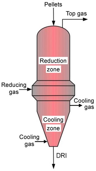 - Nouri, S.M.M.; Ebrahim, H.A.; Jamshidi, E. Simulation of direct reduction reactor by the grain model. Chem. Eng. J. 2011, 166, 704–709. [Google Scholar] [CrossRef]
