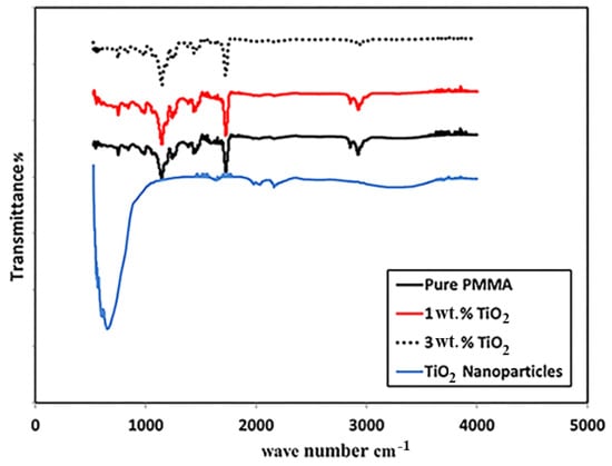 The FTIR spectra of the TiO2 NPs, neat PMMA, and its nanocomposites are shown in Figure 2. For pure TiO2, the characteristic band of M–O was observed around 600 cm−1, with a band around 2100 cm−1 corresponding to C–O, which was attributed to ambient contamination. For neat PMMA, absorption bands were observed at 2993, 1730, and 1420 cm−1, which are characteristic bands for PMMA []. The band at 3100 cm−1 could be assigned to the stretching vibration of Ti–OH and O–H formed by the C=O of PMMA. The addition of TiO2 in PMMA did not change the functional characteristics of the composite as no new absorption bands were observed []. This was because the PMMA and TiO2 were physically mixed; thus, no changes occurred in the chemical structures of the composites. Additionally, the unclear beak of TiO2 in the PMMA resin may be due to the low concentration of the nanoparticles.