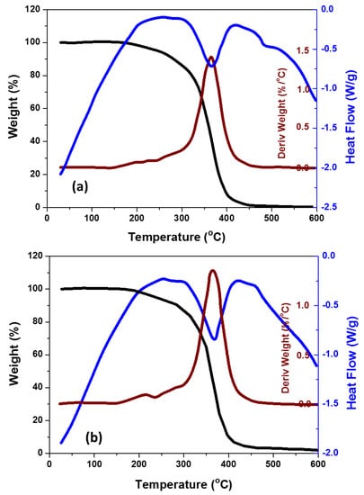 The effects of the addition of TiO2 NPs (0 wt. % and 2 wt. %) on the thermal behavior of PMMA denture bases investigated at a heating rate of 10 °C/min are shown in Figure 3. The results are represented in the form of glass transition, degradation temperatures, and rate. The glass transition temperature, thermal and degradation temperature of the nanocomposites were shown to slightly increase with an increase in the weight percentage of TiO2 in the composite. The glass transition temperature of PMMA increased from 365 °C to 368 °C due to the addition of 2 wt. % TiO2. Additionally, the results showed that the degradation of PMMA + 2 wt. % TiO2 started at 170 °C, compared to 165 °C for pure PMMA. This can be attributed to the incorporated water evaporation and decomposition of the peroxo groups. It was also observed from Figure 3 that the PMMA and its nanocomposites were completely degraded at 400 °C. This can be attributed to the rupture of the main chain and to the terminal vinyl group decomposition. Slight differences were observed between the degradation behaviors of the PMMA/TiO2 nanocomposites and pure PMMA. This slight effect on adding TiO2 NPs in the PMMA matrix could be due to the low content of NPs in the matrix and to the small size and weight of the DSC specimens. In other words, the addition of TiO2 nanofillers did not have an influence on the mobility of the PMMA chain segments, leading to nearly the same values of glass transition and degradation temperatures for the tested nanocomposites. Similar results have been reported previously [,], wherein the DSC and TGA results showed negligible changes with the addition of small concentrations of TiO2.