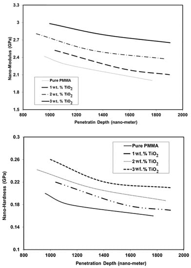 The nanomechanical characteristics of the PMMA/TiO2 specimens were measured using a universal nanomechanical tester (Bruker, Campbell, CA, USA). To reduce the vibration during measurements, the machine was equipped with an anti-vibration isolation table. Nanohardness and elastic modulus were measured by a nanoindentation machine at room temperature. Hardness and modulus are functions of maximum applied load and contact penetration depth. During the test, a holding time of 15 s was considered between the loading and unloading processes to reduce the effects of creep.
