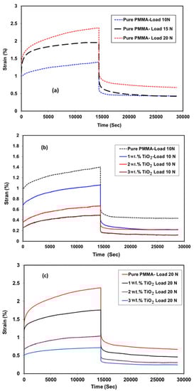 The effects of the addition of TiO2 NPs on the creep and recovery behaviors of PMMA is shown in Figure 5. The results are presented as creep and recovery strains against time at different loads for PMMA and its nanocomposites. The creep curves showed that the material initially underwent elastic deformation in a very short time as the strain was slowly increased at constant stress. Following the removal of load, part of the elastic strain rapidly recovered, while the other creep strain portion slowly recovered with time; the remaining strain was considered as the permanent deformation. Figure 5a describes the effects of applied load on the creep behavior of pure PMMA. The creep strain increased as a result of the increasing applied load []. The creep strain after 240 min increased from 1.4% to 2% and 2.4% when the applied load was increased from 10 to 15 and 20 N, respectively. Figure 5b,c show the effects of adding TiO2 NPs on the creep strain of PMMA at applied loads of 10 and 20 N, respectively. The results showed that the creep strain decreased from 1.4% to 1.1%, 0.7%, and 0.5% due to the addition of 1 wt. %, 2 wt. %, and 3 wt. % TiO2, respectively, at a load of 10 N. This improvement in the creep behavior of the PMMA denture bases indicated a longer working life for the dentures.