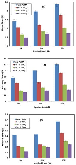 In addition, the strain values decreased from 2.4% to 1.8%, 1.1%, and 0.8%, respectively, when the applied load was increased to 20 N. The reduction in creep strain due to the presence of TiO2 NPs could be because these NPs increase the stiffness of the PMMA matrix, thus reducing its free volume and molecular mobility. Similar results were also obtained for PMMA and other semi-crystalline polymers where the creep behavior improved with the addition of different NPs []. The effects of adding TiO2 to PMMA on recovery strain (just after removing the load) and residual strain after removing the load within 240 min showed the same trend as that for the creep strain. Figure 6 summarizes the effects of load and TiO2 NP addition on the creep, recovery, and residual strain of the materials under investigation.
