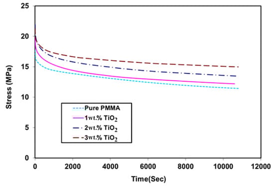 Figure 7 shows the effects of TiO2 NP addition on the relaxation behavior of PMMA as a function of time under 1% total strain. The results indicated that all materials under consideration responded to the strain with stress values of up to 17.7 MPa for pure PMMA. This resulting stress decreased with time; after 3 h, the resulting stress value was about 30% of its initial value. Due to the addition of TiO2, the resulting stress on the PMMA nanocomposite became higher than that on pure PMMA. This could be considered as an improvement in the nanocomposite properties, as indicated by the nanomechanical and creep behavior. As mentioned earlier, the presence of rigid TiO2 NPs increased the stiffness of the PMMA matrix and reduced its free volume and molecular mobility [,]. The values of initial stress under 1% strain were 19.9, 21.2, and 22 MPa with the addition of 1 wt. %, 2 wt. %, and 3 wt. % TiO2, respectively. For the PMMA/3 wt. % TiO2 nanocomposite, the stress value at the end of the test was 17.5 MPa (decreased by 20%).