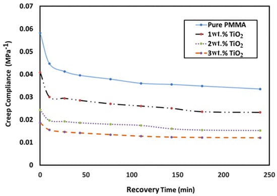 Figure 8 shows the variation in recovery creep compliance with respect to the TiO2 NP loading ratio and recovery time. The results indicated that the creep compliance values decreased with recovery time for PMMA and its nanocomposites. Furthermore, the creep compliance decreased (improved) significantly as the TiO2 NP content increased. This could be attributed to the improvement in the PMMA stiffness due to the addition of nanoparticles. For example, the value of creep compliance decreased from 0.06 to 0.019 with the addition of 3 wt. % TiO2.