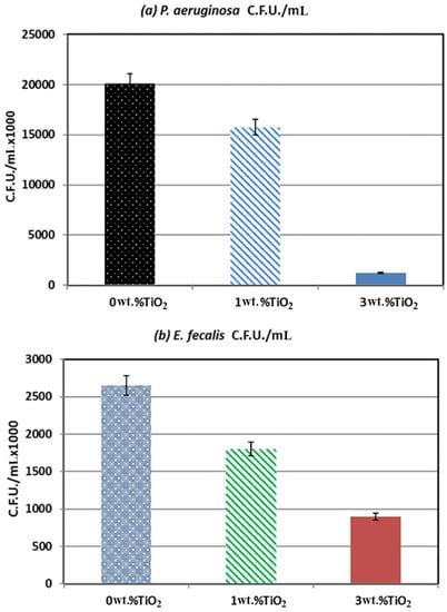 PMMA scaffolds with TiO2 concentrations of 0 wt. % (control), 1 wt. % (minimum), and 3 wt. % (maximum) were used for the microbial adhesion analysis. As shown in Figure 9, E. faecalis showed a much smaller drop in attached cells than P. aeruginosa with the PMMA scaffold. E. faecalis with 0%, 1%, and 3% TiO2 contained 2.65 × 106, 1.8 × 106, and 9 × 105 C.F.U./mL, respectively. The scaffold strip showed an attached-cell drop rate of about 38% when the TiO2 content was increased from 0% to 1%, and when the TiO2 content was increased from 1% to 3%, there was a 50% drop in the attached cells.