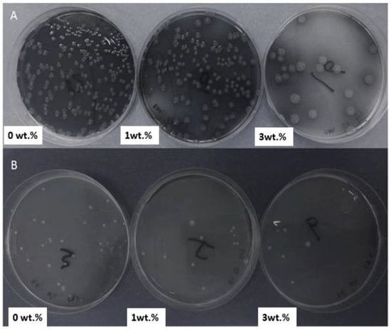 (A) C.F.U. of P. aeruginosa on nutrient agar after growing it on PMMA composites containing 0 wt. %, 1 wt. %, and 3 wt. % TiO2 for 48 h. (B) C.F.U. of E. faecalis after growing it on PMMA composites containing 0 wt. %, 1 wt. %, and 3 wt. % TiO2.