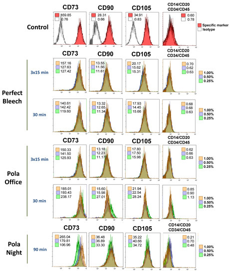 3.6. Analysis of the Expression of Mesenchymal Stem Cell Surface Markers on hDPSCs Exposed to Bleaching Extracts Using Flow Cytometry