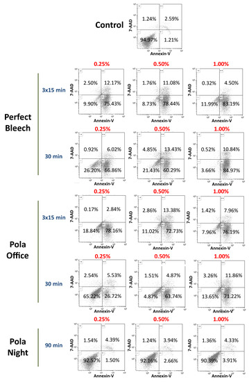 3.7. Apoptosis/Necrosis of hDPSCs in the Presence of Bleaching Extracts