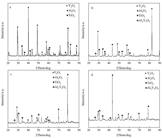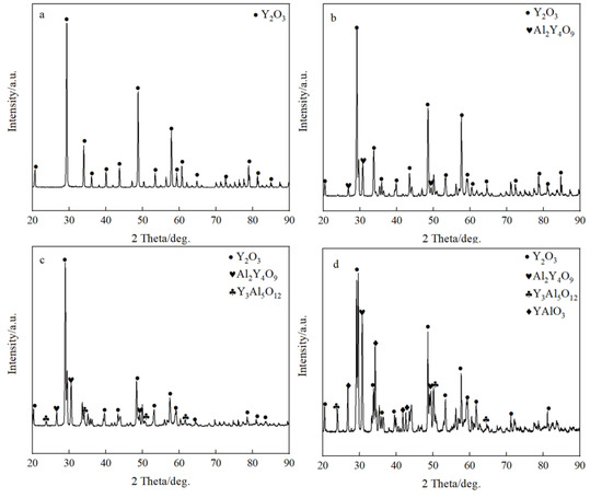 The XRD spectrum of composite crucibles before the melting experiment. (a) The pure Y2O3 crucible; (b) Al2O3-A crucible, containing 3.5 wt % Al2O3; (c) Al2O3-B crucible, containing 7.0 wt % Al2O3; (d) Al2O3-C crucible, containing 10.5 wt % Al2O3.