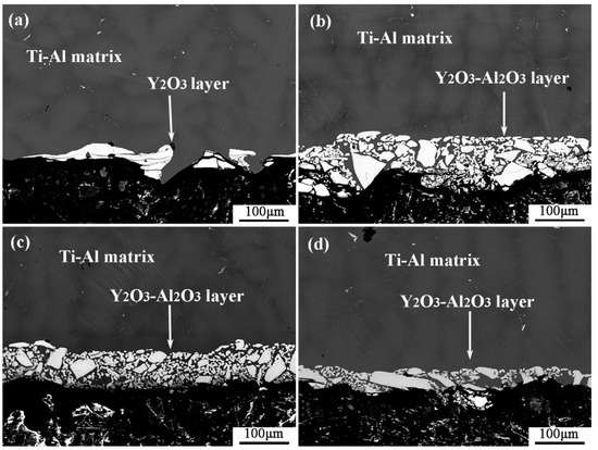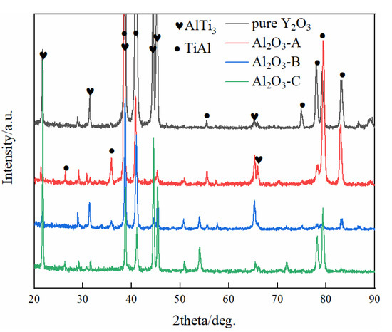 Figure 3 shows the microstructure of the metal-crucible contact interface after the melting experiment. The molten metal penetrated into the crucible at the interface and then adhered to oxide layer from the crucible. As shown in Figure 3a, the interface layer in the pure Y2O3 crucible was discontinuous. The greatest thickness was about 100 µm, while the thinnest was about only a few microns. It can be seen that the white substance bonded to the metal was almost a complete Y2O3 coarse sand particle. The interface layers of Al2O3-A, Al2O3-B and Al2O3-C crucible (Figure 3b–d) were continuous and uniform. Compared with the pure Y2O3 crucible, the oxide particles that adhered to the metal were relatively small. The thickness of the interface layer of the Al2O3-A crucible was the largest, about 150 µm, and the particles in the interface layer were fine and loose. The thickness of the interface layer of Al2O3-B crucible was about 100 µm, and the white particles were fine, but the arrangement was relatively close relative to that of the Al2O3-A crucible. The thickness of the interface layer of the Al2O3-C with the most Al2O3 powder was about 50 µm, and the proportion of fine white oxide particles decreased. The XRD diffraction pattern of the interface layer (Figure 4) showed that the interface layer of the pure Y2O3 crucible had Y2O3, Al2O3 and a small amount of TiO2, but at the interface of Al2O3-A, Al2O3-B and Al2O3-C crucibles, besides the above three substances, Al2Y4O9 was also detected.