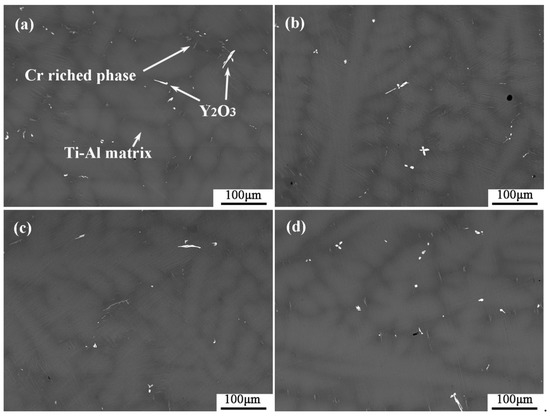 Figure 5 shows the microstructures of the interior of the alloys after the melting experiment. A large number of coarse grayish dendrites were distributed in the dark gray matrix, and a small number of irregular phases with bright white and grey contrast were dispersedly distributed among them. The grey precipitates were mainly distributed in the deep gray between dendrites, presented as tiny needles. Bright white precipitates were mainly distributed among dendrites, and there were a small number of dendrites. Some of them were elongated, some were plum-like flowers, and some were distributed small particles. The XRD spectra of the interior of metal particles after melting experiments are shown in Figure 6. There were only two phases of TiAl and AlTi3. The presumed results may not be shown in diffraction patterns due to too little precipitation. The EDS analysis of the precipitated bright with white contrast and gray matter contrast is shown in Table 3. The atomic percentage of heavy Cr in the gray contrast reached 23–25%, and it is known that it was a rich Cr phase precipitate, and the Cr in the matrix was easily segregated in the interdendritic area. The ratio of Y and O in white contrast material was close to 1:1, and at the same time, contained a small amount of Al. It is speculated that it was an oxide that contained Y and Al, and it was formed during the melting process of the metal from the crucible to the metal melt.