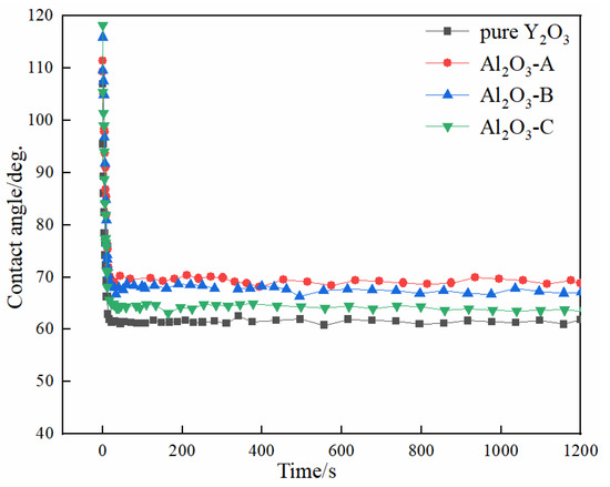 From the chemical point of view, the pure Y2O3 crucible without Al2O3 was more thermodynamically stable than composite crucibles with Al2O3. The Al2O3 and TiO2 detected in the interfacial layer (Figure 4) were presumably speculated to be formed by the combination of free O and Ti atoms and Al atoms in the melt during the metal melting experiment. In the metal melting experiment, the amount of oxide inclusions in the pure Y2O3 crucible entering the metal was the least because Y2O3 has higher chemical stability than Al2O3 and is less likely to react chemically with the molten alloy. Therefore, the number of oxide inclusions in the alloy obtained by Al2O3-A, Al2O3-B and Al2O3-C crucibles was higher than that of the pure Y2O3 crucible. Secondly, from the physical effect, the high temperature metal melt has a physical erosion effect on the crucible. The microstructure of the crucible surface (Figure 1) showed that the Y2O3 particles were the largest on the surface of the pure Y2O3 crucible, the porosity was the smallest and the surface was the most compact. In order to further clarify the mechanism of interaction between molten metal and the crucible, high temperature wetting experiments between metal and crucibles were performed. As shown in Figure 8 and Figure 9, the initial contact angles and the equilibrium contact angles of the molten metal and crucible varied with the change in composition. The initial contact angles of the pure Y2O3, Al2O3-A, Al2O3-B and Al2O3-C were 107°, 111.4°, 115.9° and 118.2°, respectively. The equilibrium contact angles were 61.5°, 69.3°, 67.7° and 64.2°, respectively. During the melting experiment, the high temperature metal melt contacted well with the crucible, and the crucible itself had high strength. Liquid metal can quickly form a protective film on the surface of the crucible, thus preventing more oxide particles from the crucible falling into the metal melt. The Al2O3-C crucible surface microstructure had fine grains, and the highest content of Al2O3 added to produce more Y3Al5O12. Y3Al5O12 belongs to cubic crystal system, with garnet structure, high temperature resistance and strength at high temperatures, and its wettability was similar to that of the pure Y2O3 crucible, so it can reduce the loss to the oxide crucible alloy. The degree of interaction between the melt and composite crucible (Al2O3-A and Al2O3-B) is stronger than that between the pure Y2O3 crucible and the melt, and weaker than that between the Al2O3-C crucible and the melt. The crucible structure was relatively loose, and the wettability between metal and interface was relatively poor. Therefore, the corrosion of metal in the crucible was considerable, and the content of oxide inclusions in molten alloys was higher than that in pure Y2O3 and Al2O3-C.