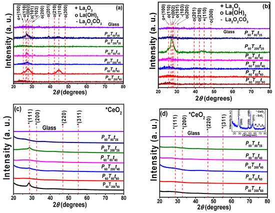 XRD patterns of sputtered (a) lanthanum coatings at constant power P = 60 W, (b) lanthanum coatings at constant power P = 80 W, (c) cerium coatings at constant power P = 60 W, (d) cerium coatings at constant power P = 80 W. The samples were deposited on glass substrates varying deposition time (25, 40 and 60 min) and substrate temperatures (80 and 200 °C).
