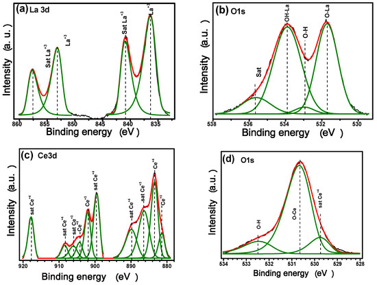 The La3d core level spectra of lanthanum compounds show their well-known splits into 3d5/2 and 3d3/2 components (due to a spin–orbit interaction) with their characteristic doublet (Figure 2a). The peaks at 853.48 and 836.71 eV matched well with La3+ species. The corresponding satellite peaks are observed at 857.97 and 841.17 eV, respectively, with a separation of the main peak of ΔE ≈ 4 eV which is in good agreement with previous reports [48].