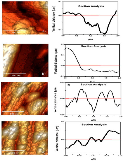 From the overall conditions and microstructural characterization of Ce and La layers, Ce/La and La/Ce oxide bilayered coatings were produced at P80T80t60 and P60T80t60 on both aluminum alloy substrates. These conditions were selected from initial electrochemical performance of the individual coatings. The topographical height profiles of bilayered coatings were analyzed by AFM analysis and shown in Figure 5a–d. It is important to mention that the analysis considered other projections to confirm the height profile. In general, the bilayered coatings showed closed aggregates or domains with a separation between them of barely 20 nm, and are ~130 nm in height. The average base roughness is clearly modified depending on the RE element that is deposited onto the metallic substrate; i.e., aluminum alloy/La(P60T80t60)/Ce(P80T80t60) and the RE layers were smoother than those observed in the aluminum alloy/Ce (P80T80t60)/La (P60T80t60) system (Table 1). The domain distribution of the lanthanum films appears non-uniformly and it seems that they tend to grow from the center to the edges. Macrodomains appear as bigger aggregates of polymorphic nanostructures in size and shape. The layer-by-layer growth mechanism of the mixed oxides shows a height from crest to valley of about 11 nm.