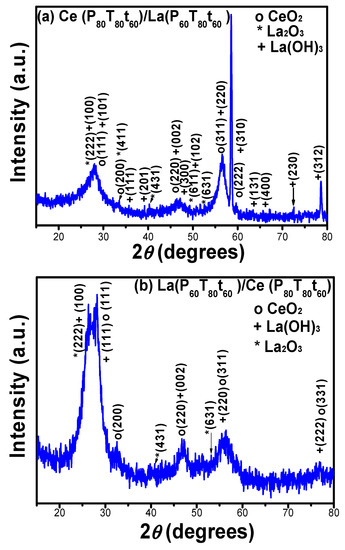 XRD of RE oxide bilayered coatings: (a) Ce(P80T80t60)/La(P60T80t60) and, (b) La(P60T80t60)/Ce(P80T80t60) onto Si (100) substrates.