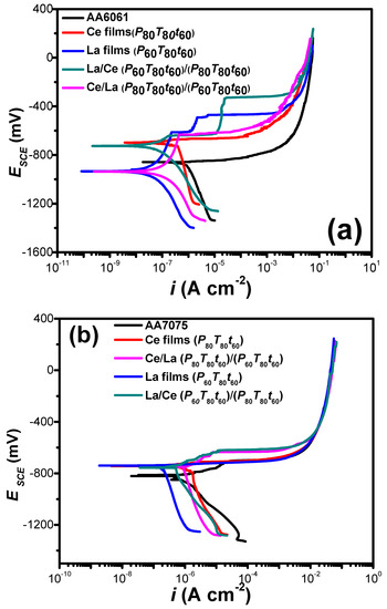 La/Ce bilayered coatings fabricated at P80T80t60 and P60T80t60 on both aluminum alloy substrates are shown in Figure 9a,b. For comparison purposes, the electrochemical performance of individual Ce or La oxide coatings, under similar deposition conditions, and bare substrates are also shown in the plot.