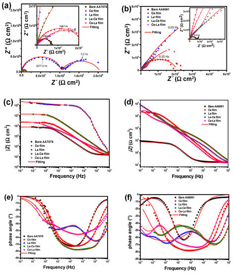 EIS is a quantitative tool to assess the corrosion protection afforded by different kinds of coatings; thus, it has been used to evaluate sputtered RE coatings on commercial aluminum alloys [45]. For comparison purposes, impedance data obtained for the bare substrates are also shown in the plots.