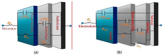 Equivalent circuits used for fitted experimental EIS data of RE coated metallic substrates. (a) bare substrates (b) coated specimens.