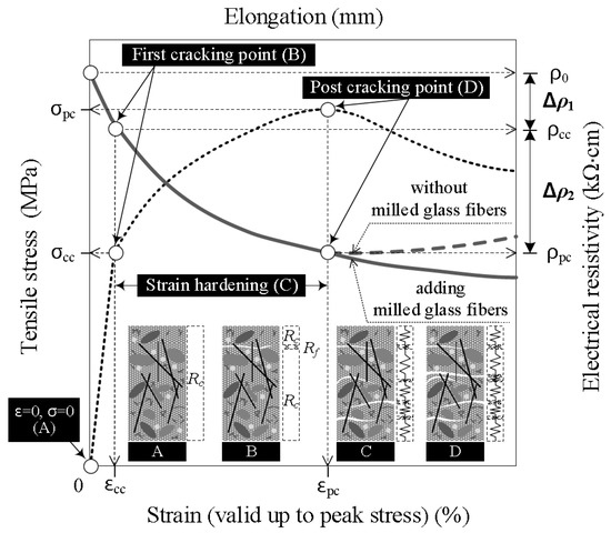 As can be seen in Equation (2) and Figure 2, to further increase the self-damage sensing capacity of HPFRCCs under tension, the value of ρc should by further increased, in this case by adding MGFs. Thus, in this study, we added MGFs, which have very low electrical conductivity, to the mortar matrix in order to further enhance the electrical resistivity of the composite (ρc).
