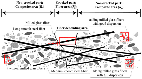 The electrical resistance of a composite (R) comprises that of both the non-cracked (Rc) and cracked (Rf) parts of the composite [41,42,44], as described in Equation (1) and illustrated in Figure 1. As the number of micro-cracks (ncr) increases during strain-hardening (Range C in Figure 1), Rc would decrease along with the decreasing total length of the non-cracked part (shown in Figure 1), whereas Rf would increase along with the increasing length of the cracked parts of the composites under tension (ΔLdebond). As Rf is much lower than Rc, the electrical resistance (R) of the specimen within the gauge length consequently decreases as the number of multiple micro-cracks increases.