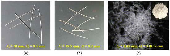 Table 2 provides the physical properties of the fibers used in the experiments, while Table 3 lists the chemical components of MGFs. The length and diameter of the long smooth fibers are 30 and 0.3 mm, respectively, while those of the medium-length smooth steel fibers are 19.5 and 0.2 mm, respectively (Figure 4a,b). The MGFs have an average length and diameter of 0.3 and 0.0135 mm, respectively, as shown in Figure 4c. The average grain diameter of silica sand is 0.43 mm, while the superplasticizer contains 25% solid content.