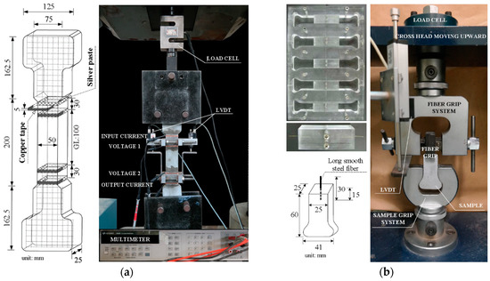 A universal test machine (UTM) with a 300-tonf capacity was used for direct tensile tests, while a UTM with a 500-kgf capacity was used for single-fiber pullout tests. During the tests, the loading speed and data frequency was maintained at 1 mm/min and 5 Hz, respectively. During the tensile tests, the applied load was obtained from a load cell (capacity: 5 tons) located on the top of the specimen, as shown in Figure 5a. The tensile elongation of the specimens was measured by two linear variable differential transformers (LVDTs), while their electrical resistivity was measured using an electrical multimeter (Model 3458A; Keysight, Santa Rosa, CA, USA). Prior to tensioning the specimens, the electrical resistivity was stabilized for at least 20 min to minimize the effects of electrical polarization. During the tensile tests, the temperature and humidity in the laboratory were 9.8 ± 6.9 °C and 30.5% ± 1%, respectively. After direct tensile tests, the equivalent number of multiple micro-cracks of all specimens was calculated by measuring the length of all micro-cracks, which was determined in this study by using Vernier calipers and dividing the total length of micro-cracks by the width of the specimen (50 mm). The length of the micro-crack would be more efficiently calculated by using image analysis techniques later [48,49]. During the single-fiber pullout tests, the pullout load was obtained from the load cell attached to the top of the cross-head, while the slip was measured from the LVDT, as shown in Figure 5b.