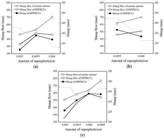 Figure 6 shows the slump flow and slump of the mortar and HPFRCCs, as the amount of superplasticizer increased from 0.005 to 0.0065, corresponding to the amount of MGFs. Figure 6a–c show those for mortar and HPFRCCs containing 0, 5, and 10 wt % MGFs. In Figure 6, the solid lines represent the slump flow and slump of HPFRCCs containing steel fibers, whereas the dotted lines represent the slump flow of the mortar mixture without steel fibers. As the amount of superplasticizer ranged from 0.005 to 0.0065, the slump flow of the mortar mixtures containing only MGFs (except steel fibers) linearly increased regardless of the amount of MGFs. The slump flows of mortar mixtures (M0.00 and M0.05) were measured as 704 and 701 mm, respectively, with a super-plasticizer content of 0.006, reaching a maximum of 772 mm in sample M0.10 containing a superplasticizer content of 0.0065. However, the slump flow and slump of the mortar mixtures containing both MGFs and steel fibers (i.e., HPFRCCs) showed a different tendency. The slump flow and slump of HPFRCCs for M0.00 and M0.10 showed a threshold response to amounts of superplasticizer of 0.0055 and 0.006, respectively. At amounts of superplasticizer greater than these thresholds, the slump flow then decreased for the M0.00 (from 482 to 465 mm) and M0.10 (from 593 to 544 mm) series. The slump also decreased after the superplasticizer thresholds were exceeded for the M0.00 and M0.10 samples. On the other hand, the optimal amount of superplasticizer in M0.05 was determined to be 0.055 because a greater amount (0.006) of superplasticizer resulted in significant fiber accumulation. Thus, the amounts of superplasticizer for a uniform distribution of both MGFs and steel fibers in the mortar matrix were determined to be 0.0055, 0.0055, and 0.006 for the M0.00, M0.05, and M0.10 series, respectively, by considering both the slump flow and slump test results.