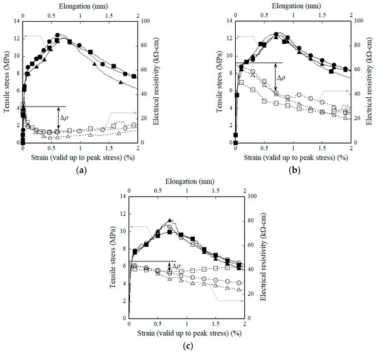 Electromechanical responses of HPFRCCs containing MGFs under tension: (a) M0.00, (b) M0.05, and (c) M0.10.